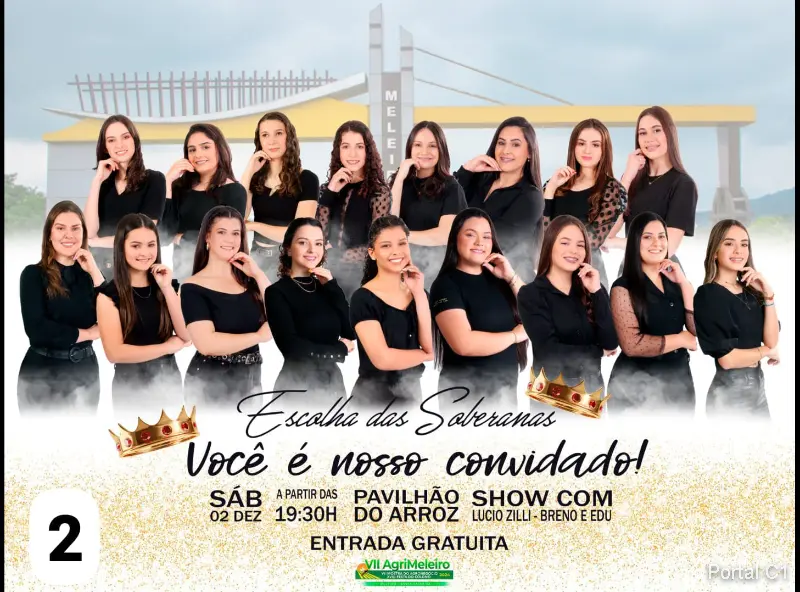 Nesta sexta-feira, 01/12 iniciam as comemorações do aniversário no Pavilhão do Arroz, com missa às 19h, pelo Pe. Victor, depois corte de um bolo de 62kg, show com a Banda La Vie. No sábado, 02/12, 19h Escolha das Soberanas da VII AgriMeleiro, show com Lúcio Zilli e Brenno e Edu. Domingo, 02/12, pela manhã, 9h início do Passeio Ciclístico, com saída da praça da matriz, a tarde, 15h30min, passeios com Trenzinho da Alegria, Apresentação do Ballet Mariah Nola, 18h30min, chegada do Papai Noel, entrega da chave ao menino Jesus, show pirotécnico, banda gospel Kairos, banda batons e Tok Musical. Todas as atrações com entrada franca e livre para todas as idades.