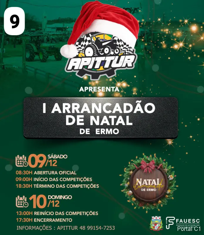 Atenção pilotos de tratores! A Associação de Pilotos de Tratores de Turvo, APITtUR E FAUESC realizam nos dias 09 e 10 de dezembro o 1º ARRANCADÃO DE NATAL em Ermo. As pistas já estão sendo preparadas e a expectativa é de cerca de 200 pilotos de tratores competindo. Mas ATENÇÃO, AS INSCRIÇÕES encerram no dia 02/12, anexo ao Posto Daminelli de Ermo.. E lembrando que o Natal Iluminado inicia no dia 07, com a chegada do Papai Noel, Dia 08, show nacional com Cesar Menotti e Fabiano e muito mais. Venha para Ermo, o Natal Iluminado espera por você e sua família!