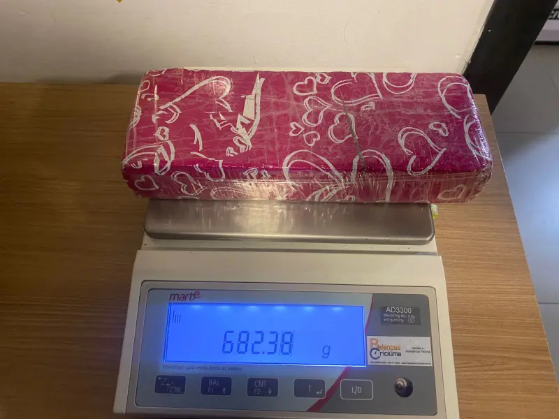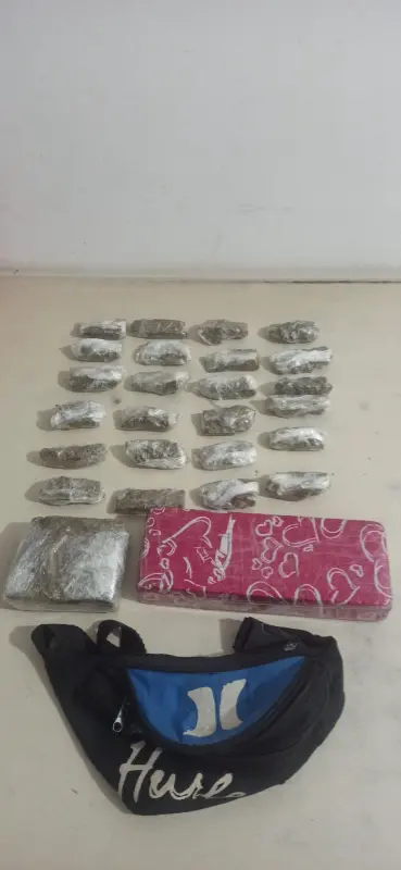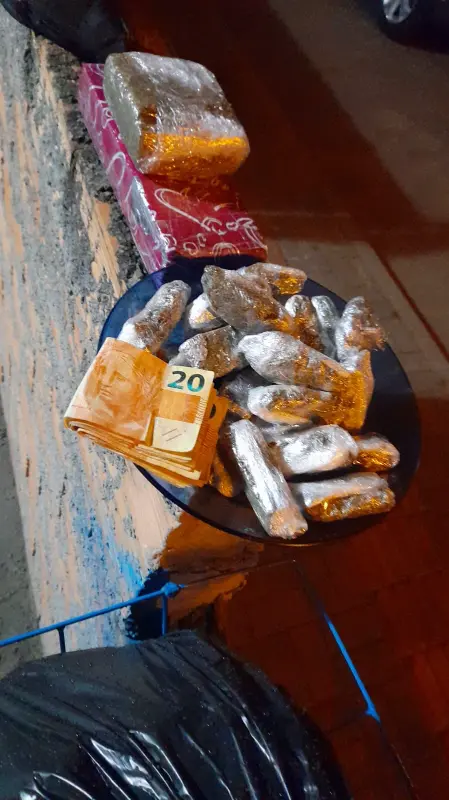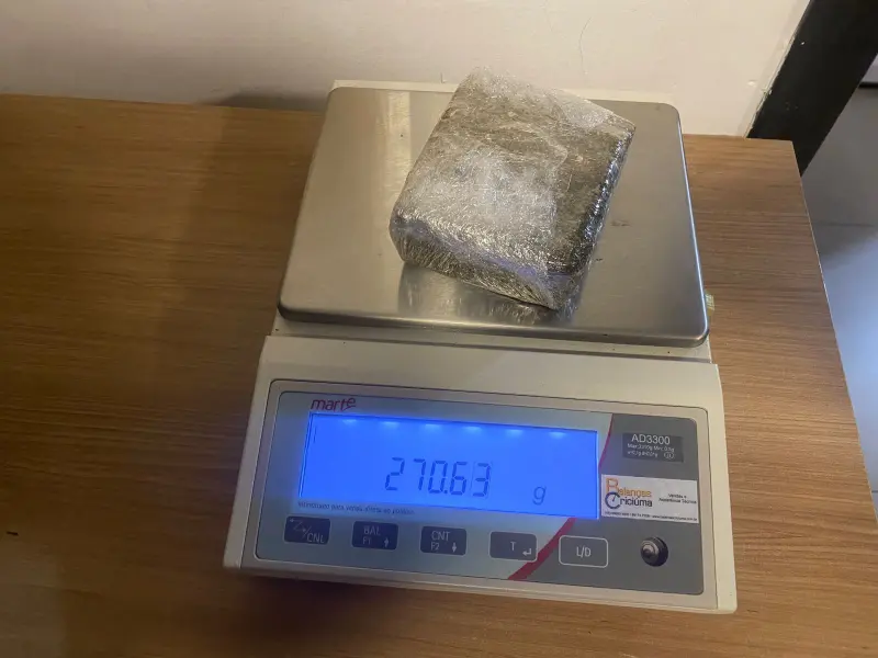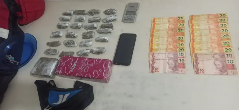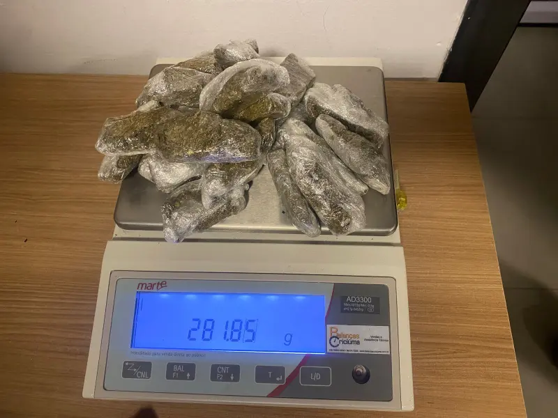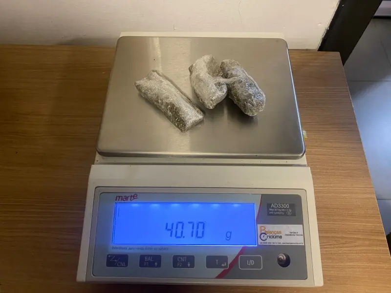 Em ato continuo, foram realizadas buscas no interior da residência, sendo que a guarnição do Canil encontrou no quarto do filho do suspeito, no roupeiro, uma pochete com três porções de maconha, pesando 40,7g. A partir disso, foi empregado o cão Argo, cujo qual encontrou embaixo da cômoda, dois tabletes de maconha, um pesando 682,38g e outro 270,63g, e dentro dos bolsos de uma jaqueta, embaixo da cama, mais 21 porções de maconha fracionadas em pequenas embalagens, pesando um total de 281,85g.